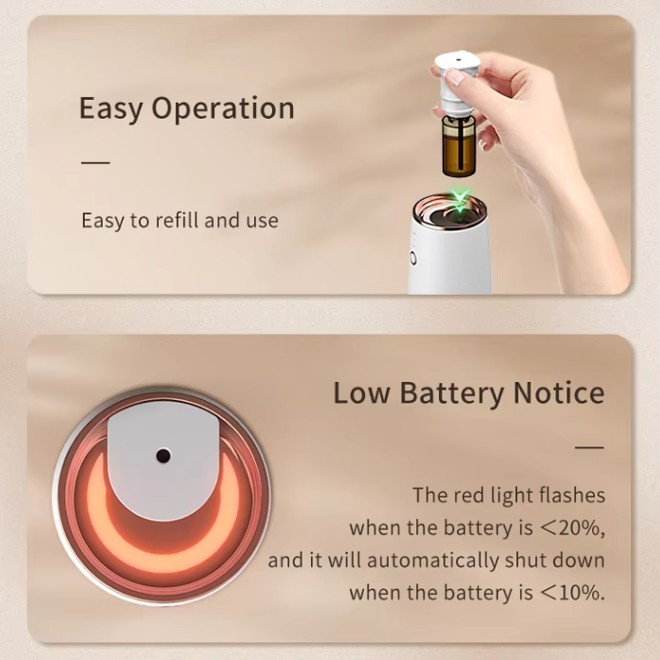 Feature: Easy to refill, Colorful lights, Portable & Convenient, Waterless atomization tech, Lightweighted. It automatically shuts downafter 48h standby time.