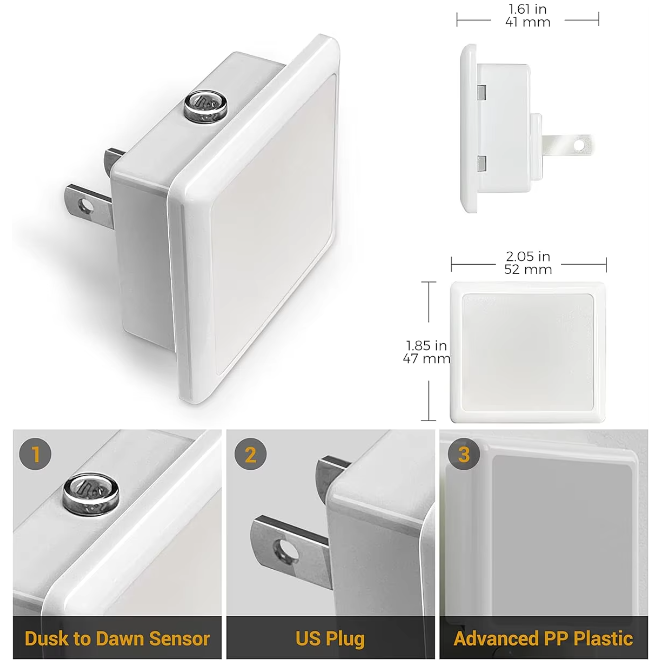 Feature: Emitting a nice warm glow, Energy-saving night light, Ultra Slim, Dusk to Dawn Sensor.