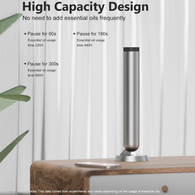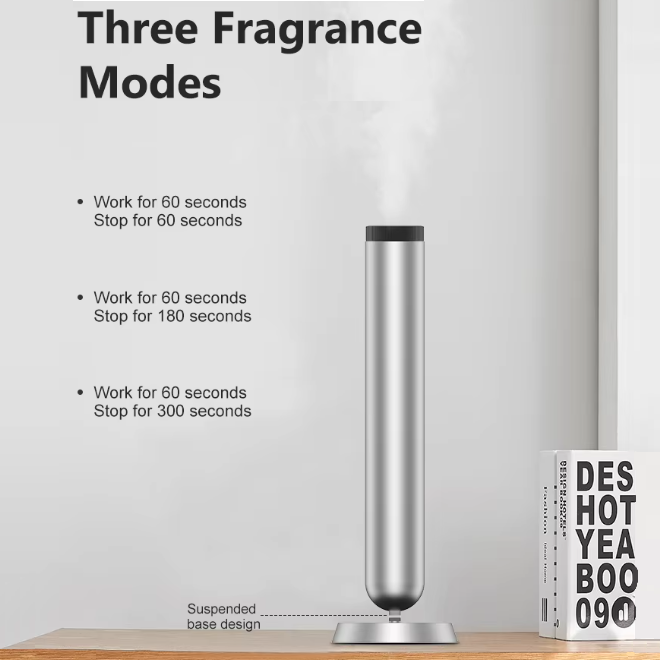 Three Fragrance Modes: 1. Work for 60 seconds, stop for 60 seconds; 2. Work for 60 seconds, stop for 180 seconds; 3. Work for 60 seconds, stop for 300 seconds.